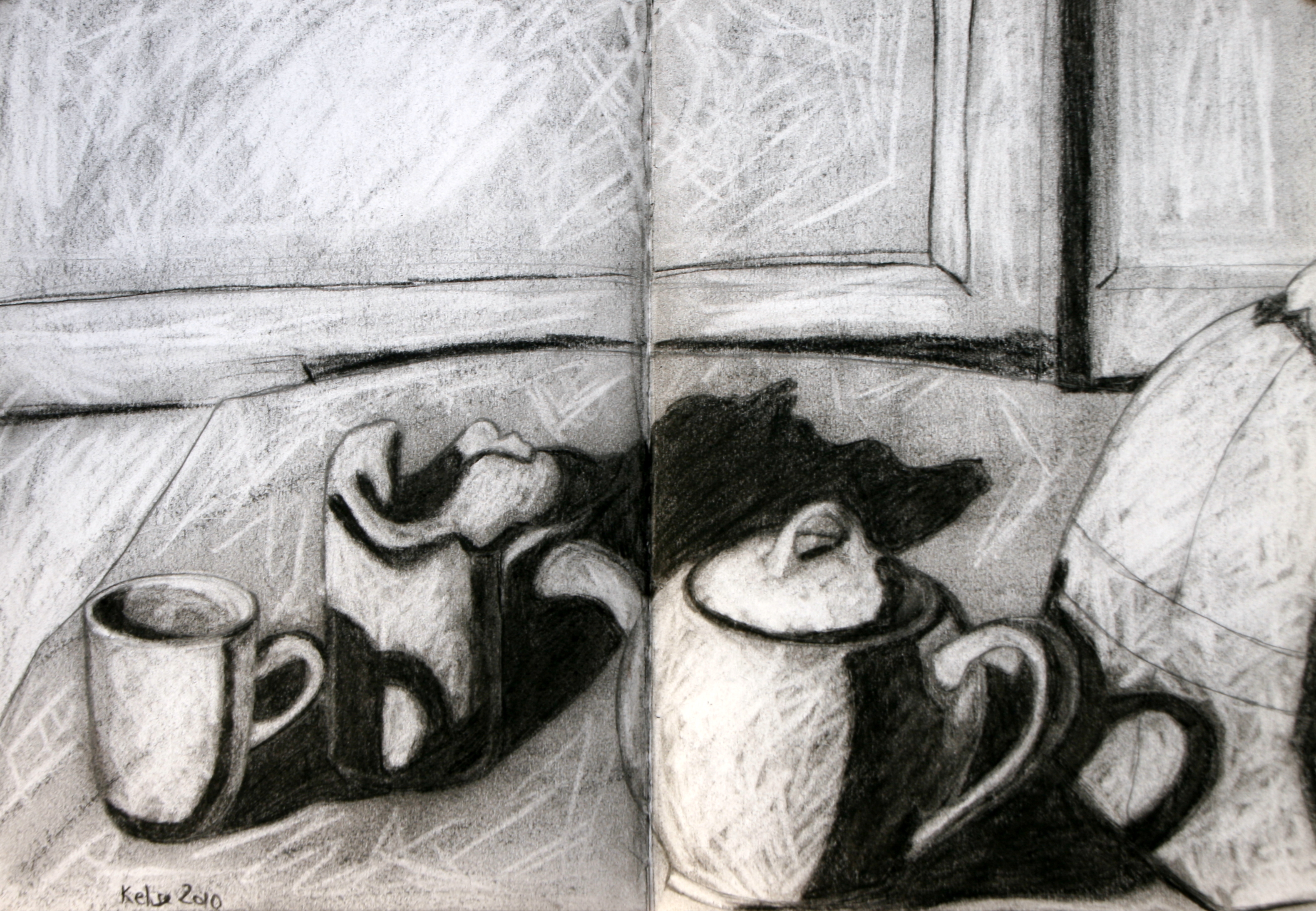 Lee Franclemont, still life (teapot, orange, pail), 1940s, charcoal on paper. Photo credit John FN Franclemont.