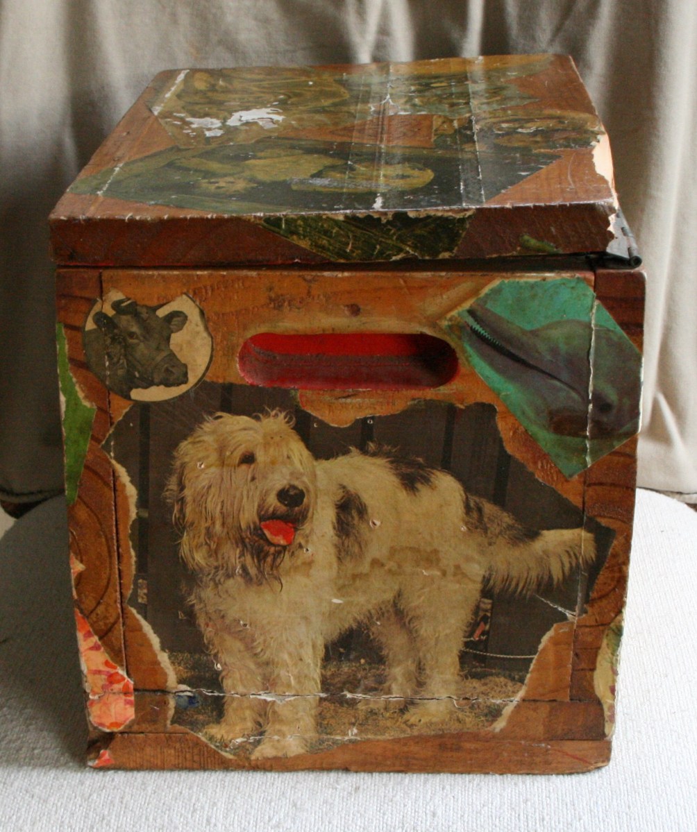 IMG_7681 Published March 18, 2016 at 1824 × 2180 Lee Franclemont, 1975, side view, decoupage on found wooden ammunition box. Photo credit Kelise Franclemont. Private collection.