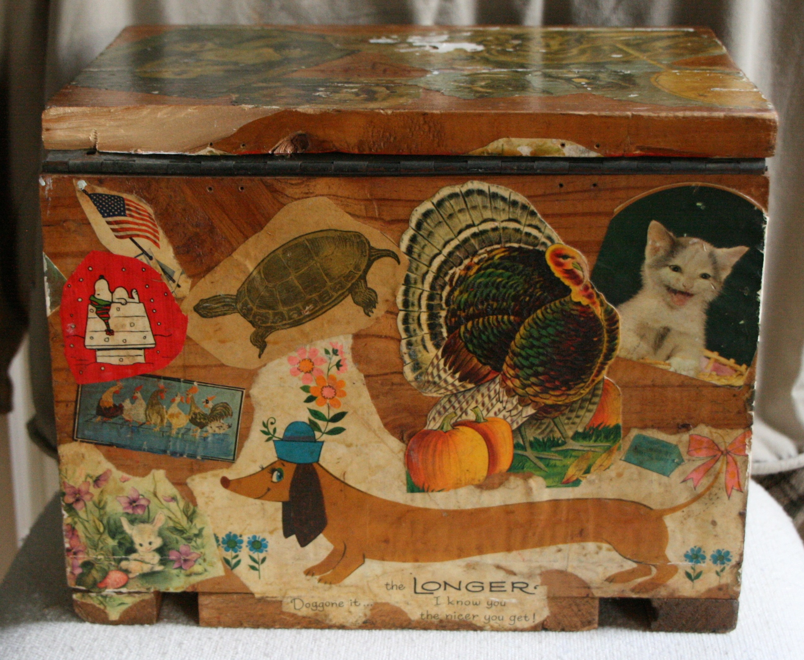 IMG_7682 Published March 18, 2016 at 2594 × 2130 Lee Franclemont, 1975, back view, decoupage on found wooden ammunition box. Photo credit Kelise Franclemont. Private collection.