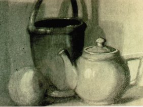 still life (teapot, orange, and pail), 1940s